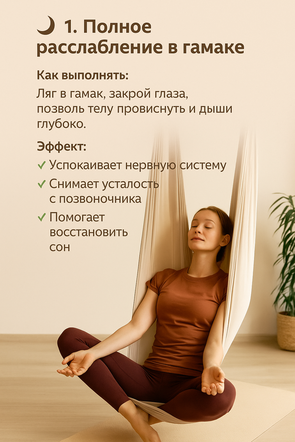 Ляг в гамак, закрой глаза, позволь телу провиснуть и дыши глубоко.