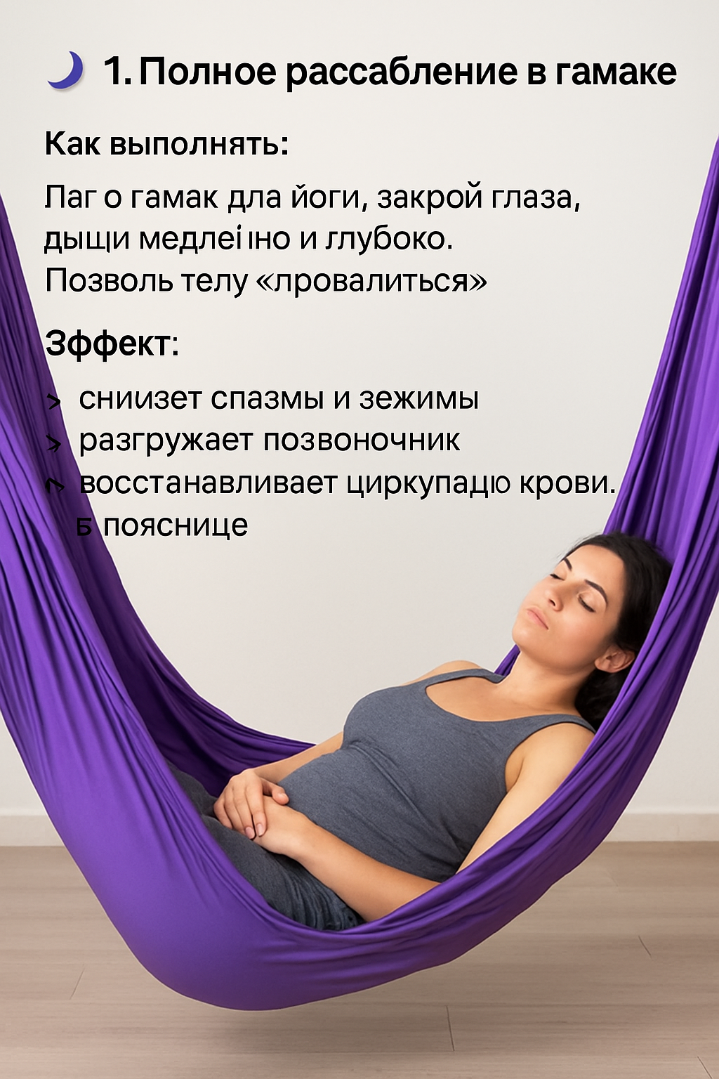 Ляг в гамак для йоги, закрой глаза, дыши медленно и глубоко. Позволь телу «провалиться».