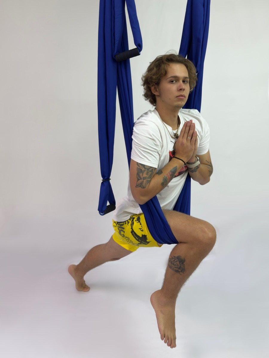Одна рука в полотне или гамаке, корпус наклонён вбок. Плавно дыши, не задерживая дыхание.