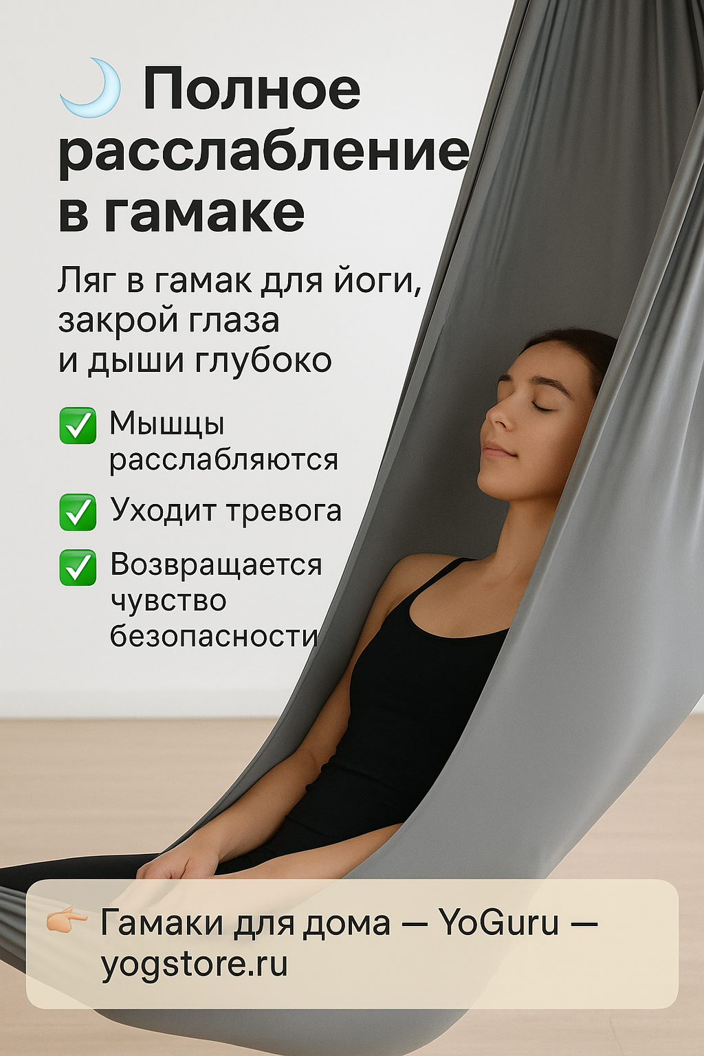 Одна рука в гамаке или полотне, мягкий наклон в сторону.