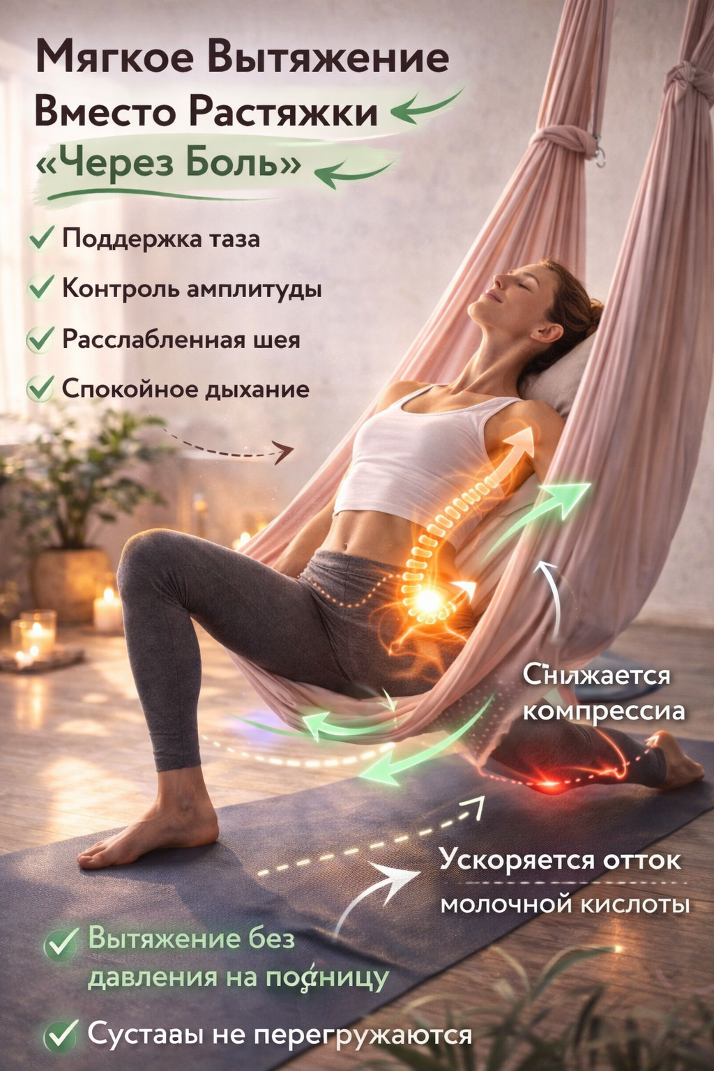 Гамаки для йоги создают ощущение безопасности, благодаря чему нервная система быстрее переключается в режим восстановления.