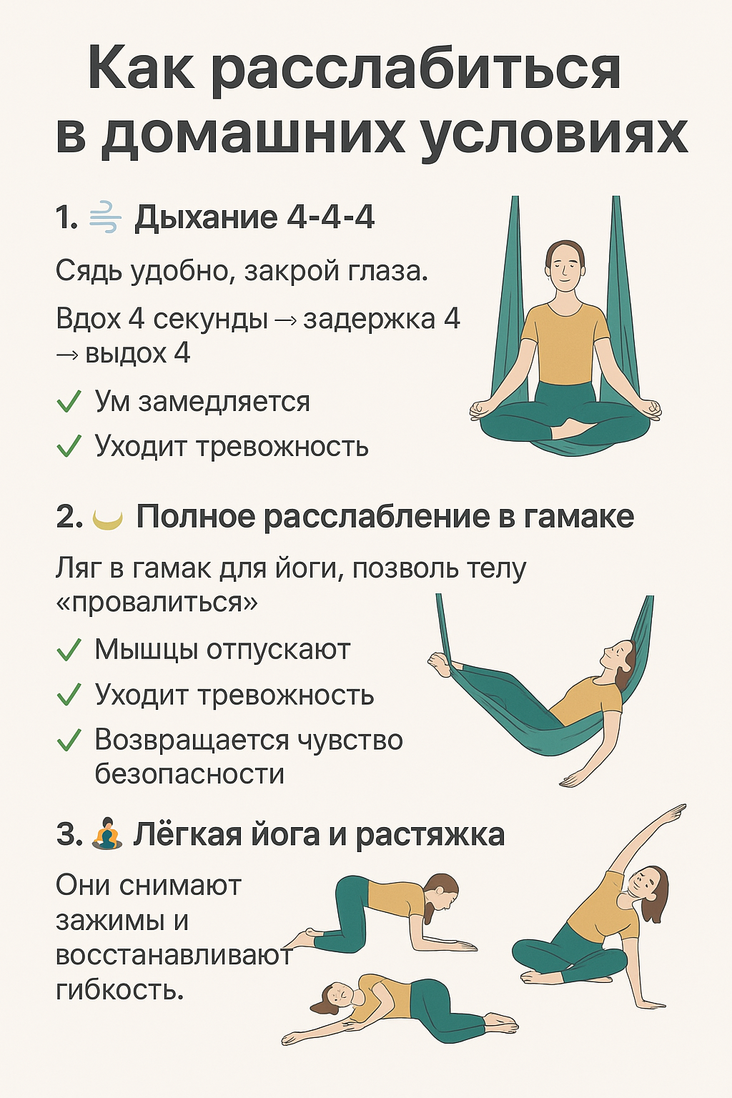 Стресс и усталость накапливаются в теле. Если их игнорировать, появляются зажимы в мышцах, головные боли и проблемы со сном. Но есть хорошие новости: расслабиться можно прямо дома — без таблеток и сложных техник.