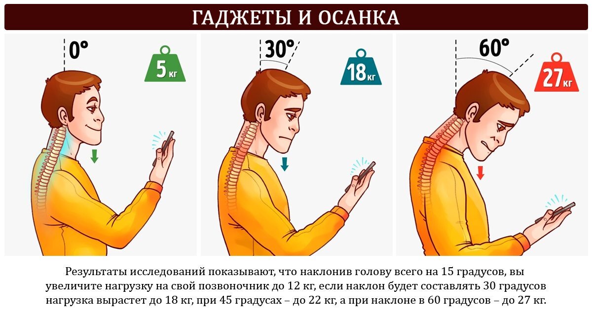 Мы держим телефон внизу, а голова уходит вперёд. В итоге — перегруз шейных позвонков и постоянное напряжение.